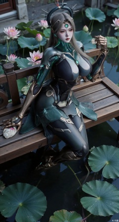 (masterpiece:1.2),best quality,The image is a digital illustration of a young woman sitting on a wooden bench in a pond with lily pads. She is wearing a long dress with design on the chest and sleeves. The dress has a high neckline and short sleeves,Holding a lotus in hand. She has long dark hair styled in loose waves and is wearing gold high heels. The woman is posing with one hand on her hip and the other resting on the edge of the bench. The background is filled with pink and white lotus flowers and green leaves. The overall mood of the image is peaceful and serene,(huge breasts:2.99),(full breasts:2.99),(Background with traditional Chinese architecture, lotus pond and pink lotus flowers:1.39),,Xanmiaoyi,Xyunwangshu,XlishaoyinY,Xbaixue,XanmiaoyiY,Xxiuqiuhua,XbaiyuerongY,XyunyunX,XqingnvzongZM,Xjuzi,Xshangguanweier,XanmiaoyiXY,XyunyunXY,Xjiangziyue,Xmeining,Xweinina,Xlenhuan,Xbabata,Xhewanyuzhiyao,XzixiaY,Xyilinna,Xyinxuehou,Xpoyuhou