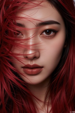 plns, Red hair gently covers her face. The woman has enchanting eyes and delicate makeup, creating a passionate and mysterious atmosphere in the picture., portrait,Western woman,beauty, portrait,vivid color