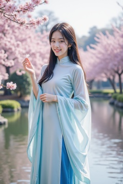 This is a high-resolution photograph featuring a young Asian woman standing in a serene outdoor setting, likely a garden or park, during springtime. She is dressed in a traditional Chinese qipao, a long, flowing gown with a high collar and wide sleeves. The gown is made of a soft, pastel blue fabric with a subtle gradient, transitioning from a pale blue at the top to a deeper, more vibrant blue at the bottom. The sleeves are long and loose, with white linings that add a touch of contrast.The woman has long, straight black hair, styled with a traditional hairpin, and she wears a gentle, natural smile. She holds a single peach blossom petal in her right hand, delicately lifting it towards her face. The background showcases a serene pond with gently rippling water, and the surrounding area is adorned with blooming cherry blossom trees, their branches laden with soft flowers. The sky above is clear and bright, suggesting a sunny day. The overall atmosphere of the photograph is calm, peaceful, and full of natural beauty, enhanced by the soft pastel colors and the delicate textures of the fabric and peach blossoms.