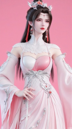 1 beauty wearing pink dress, long hair, brown hair, jewelry, earrings, hair accessories, forehead accessories, white dress, legs exposed, upper body close-up. Long sleeves. Solid color background.