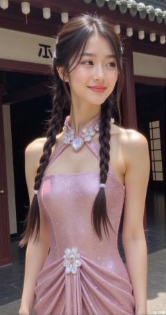 Magazine cover, fisheye,,1girl, solo,全身, twin braids,,,dress, bare shoulders, short sleeves, glitter dress,chinese style architecture,