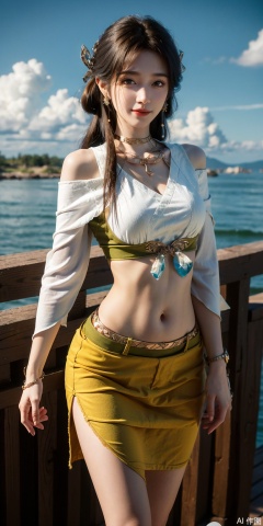 ,Short skirt,Blue sky, white clouds, ocean, nai3, 1girl, solo, crop top, , choker, navel, shirt, midriff, crop top overhang, looking at viewer, white shirt, jewelry, breasts, bare shoulders, off-shoulder shirt, off shoulder, black choker, thighs, stomach, long hair, bracelet, short sleeves, ribbon, hand up, collarbone, hair ribbon, medium breasts, , bra strap, , hair ornament, thigh gap, necklace, expressionless,meining