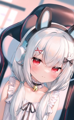 masterpiece,very aware,highres,absurdres,newest,best quality,loli,petite,high quality,chromatic_aberration,cinematic_angle,dutch angle,Light Blue Theme,//,1girl, swivel_chair, headphones, solo, fake_animal_ears, animal_ear_headphones, red_eyes, animal_ears, office_chair, rabbit_hair_ornament, twintails, long_hair, gaming_chair, hair_ornament, bell, on_chair, blush, low_twintails, chair, looking_at_viewer, white_hair, frills, hairclip, closed_mouth, sitting, x_hair_ornament, hair_bow, bow, neck_bell, rabbit_ears, collarbone, indoors, jingle_bell, white_dress, bare_shoulders, sleeveless, hair_over_shoulder, choker, upper_body, white_bow, hair_between_eyes, frilled_choker, off_shoulder, monitor, grey_hair, white_camisole, armchair//,//,official art,depth of field,detailed light,blurry background,best shadow,shiny skin,cinematic lighting,ray tracing,amazing quality,very aesthetic,absurdres,beast quality,ultra detailed,newest,8K,HDR,//,<lora:guizhencao——【noob】hans:0.88>,