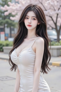 1girl, long flowing hair, looking directly at viewer, simple standing pose, casual white dress, soft daylight, clean background, cowboy-shot, natural makeup, gentle smile, urban park setting, subtle breeze, realistic proportions, warm color palette.juru2