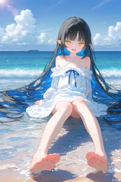 1girl, colored inner hair, barefoot, feet, outdoors, black hair, ocean, toes, pointy ears, dress, white dress, multicolored hair, long hair, sitting, sky, solo, day, yellow eyes, blue sky, teeth, looking at viewer, cloud, legs, soles, blue hair, halterneck, smile, water, bare shoulders, off shoulder, very long hair, open mouth, sharp teeth, beach, drill hair, bare legs, long sleeves, criss-cross halter, two-tone hair, blush, full body