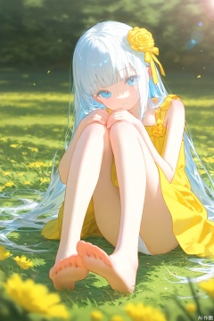 solo, 1girl, barefoot, sitting, feet, flower, white panties, panties, blurry, long hair, underwear, dress, yellow dress, looking at viewer, toes, blue eyes, hair ornament, bare legs, blunt bangs, depth of field, legs, blurry foreground, soles, parted lips, knees up, white hair, grass, outdoors, very long hair, sleeveless dress, yellow flower, sleeveless, holding