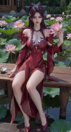 (masterpiece:1.2),best quality,The image is a digital illustration of a young woman sitting on a wooden bench in a pond with lily pads. She is wearing a long dress with design on the chest and sleeves. The dress has a high neckline and short sleeves,Holding a lotus in hand. She has long dark hair styled in loose waves and is wearing gold high heels. The woman is posing with one hand on her hip and the other resting on the edge of the bench. The background is filled with pink and white lotus flowers and green leaves. The overall mood of the image is peaceful and serene,(huge breasts:2.99),(full breasts:2.99),(Background with traditional Chinese architecture, lotus pond and pink lotus flowers:1.39),,Xanmiaoyi,Xyunwangshu,XlishaoyinY,Xbaixue,XanmiaoyiY,Xxiuqiuhua,XbaiyuerongY,XyunyunX,XqingnvzongZM,Xjuzi,Xshangguanweier,XanmiaoyiXY,XyunyunXY,Xjiangziyue,Xmeining,Xweinina,Xlenhuan,Xbabata,Xhewanyuzhiyao,XzixiaY,Xyilinna,Xyinxuehou,Xpoyuhou,XshengcaierY,Xmengyuyi,Xxiaomei,Xgufenghuaqiang