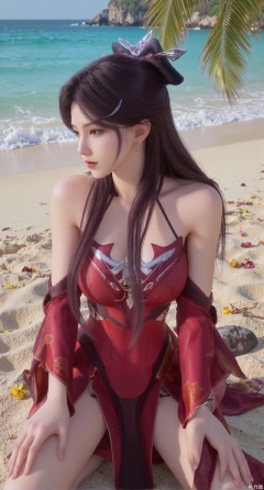 (masterpiece:1.2),best quality,absurdres,masterpiece,original,extremely detailed wallpaper,perfect lighting,Golden sandy beach covered with vibrant flowers, turquoise waves gently lapping the shore, , bright flower clusters spreading from sand to palm tree roots, soft natural light filtering through coconut leaves, ocean breeze lifting hair and qipao hem, high-resolution details showcasing petal textures and silk fabric sheen, ultra-wide angle lens capturing coastline panorama, cinematic color grading with soft focus on the central figure,(huge breasts:2.99),(full breasts:2.99),XshengcaierY,Xmengyuyi,Xxiaomei,Xgufenghuaqiang