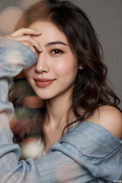 plns, The woman gently covers her forehead with her sleeve. Her eyes are bright and smiling, and her hair is scattered casually. Against the stable - toned background, she presents a casual and vivid beauty., portrait,double-exposure,vivid color
