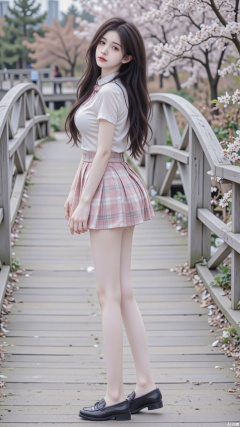 1girl,solo,looking backwards,long hair,school uniform,Collared white shirt(short sleeves),bowtie,white pantyhose,pleated skirt(pink and white tartan),black loafers,short sleeves,white pantyhose,standing,outdoors.river,wooden bridge,shoes, day, tree,cherry blossoms,juru2