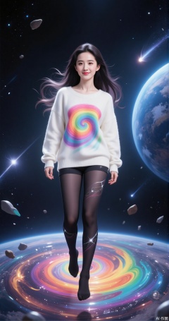 a person floating in space, surrounded by a colorful, swirling vortex on the ground