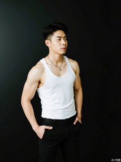photo, an Asian man with short black hair, wearing a white sleeveless vest and black pants, stands against a dark gradient background. His skin color is average, and he also has a silver necklace. His posture was very cold, with one hand in his pocket and staring to the left.