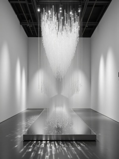 A black-and-white photograph of a modern art installation featuring a large, vertical, crystal-**** structure with numerous hanging, translucent rods creating a cascading effect. The installation is centered on a reflective, square platform, casting intricate shadows on the smooth, dark floor. The background is a plain, white wall, enhancing the minimalist aesthetic.