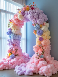 A vibrant photograph of a whimsical, cloud-**** archway **** of pastel-colored cotton candy, adorned with colorful flowers and butterflies. The archway is set against a light blue wall with sheer white curtains. The soft, fluffy textures and pastel hues create a dreamy, ethereal atmosphere.