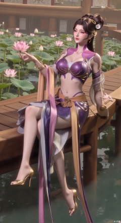 (masterpiece:1.2),best quality,The image is a digital illustration of a young woman sitting on a wooden bench in a pond with lily pads. She is wearing a long dress with design on the chest and sleeves. The dress has a high neckline and short sleeves,Holding a lotus in hand. She has long dark hair styled in loose waves and is wearing gold high heels. The woman is posing with one hand on her hip and the other resting on the edge of the bench. The background is filled with pink and white lotus flowers and green leaves. The overall mood of the image is peaceful and serene,(huge breasts:2.99),(full breasts:2.99),(Background with traditional Chinese architecture, lotus pond and pink lotus flowers:1.39),,Xzhihua,Xsiyouyou,Xyanruyu,Xmoxiaonan,Xyeqingxian,Xyinxuehou,Xpoyuhou,XbaihehuaiX,Xjiangbilan,Xhuajin,XshengcaierY,Xmengyuyi,Xxiaomei,Xhujiaoer,Xfuxinyun,Xhumeier