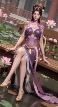 (masterpiece:1.2),best quality,The image is a digital illustration of a young woman sitting on a wooden bench in a pond with lily pads. She is wearing a long dress with design on the chest and sleeves. The dress has a high neckline and short sleeves,Holding a lotus in hand. She has long dark hair styled in loose waves and is wearing gold high heels. The woman is posing with one hand on her hip and the other resting on the edge of the bench. The background is filled with pink and white lotus flowers and green leaves. The overall mood of the image is peaceful and serene,(huge breasts:2.99),(full breasts:2.99),(Background with traditional Chinese architecture, lotus pond and pink lotus flowers:1.39),,Xzhihua,Xsiyouyou,Xyanruyu,Xmoxiaonan,Xyeqingxian,Xyinxuehou,Xpoyuhou,XbaihehuaiX,Xjiangbilan,Xhuajin,XshengcaierY,Xmengyuyi,Xxiaomei,Xhujiaoer,Xfuxinyun,Xhumeier