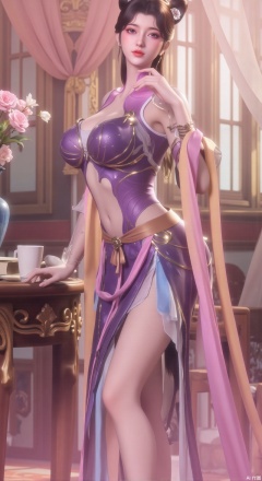 (masterpiece:1.2),Ultra clear, wallpaper, 8k, masterpiece, 1girl, solo, long hair, breasts, looking at viewer, bangs, large breasts,long dress,, bare shoulders, jewelry, black hair, standing, purple eyes, full body, flower, thighs, indoors, hair bun, long dress, high heels, cup, see-through, book, bare legs, window, table, white footwear, standing on one leg, curtains, pink flower, side slit, vase, ,(huge breasts:2.99),(full breasts:2.99),,,Xzhihua,Xsiyouyou,Xyanruyu,Xmoxiaonan,Xyeqingxian,Xyinxuehou,Xpoyuhou,XbaihehuaiX,Xjiangbilan,Xhuajin,XshengcaierY,Xmengyuyi,Xxiaomei,Xhujiaoer,Xfuxinyun,Xhumeier
