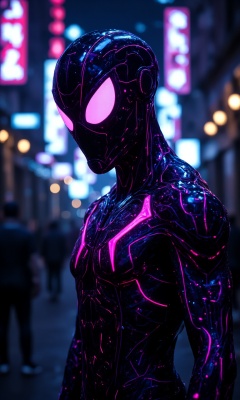 JMstyle-CGI,A highly detailed digital artwork of a character from the Marvel Cinematic Universe, specifically Spider-Man, wearing a sleek, futuristic black and pink armored suit. The suit has a glossy texture and features intricate patterns and lines that glow with a neon pink light, creating a striking contrast with the dark background. The character's face is obscured by a high-tech mask with a large, angular eye piece that glows pink, giving the suit a high-tech and somewhat robotic appearance.The background is a blurred urban setting, likely at night, with neon lights and signs in various colors, including blue, purple, and pink, adding to the futuristic and cyberpunk atmosphere. The lighting is dramatic, with the character illuminated by a soft, cool light, while the background is more shadowy and darker.The character's physique is muscular and well-defined, suggesting a strong and agile body, fitting for a superhero. The overall style is a mix of realistic and stylized, with a focus on the sleek and futuristic design of the suit and the character's physique.The image is a high-quality digital painting with a high level of detail and realism, especially in the rendering of the suit's texture and the neon lights. The artist's signature is visible in the bottom right corner, indicating a professional and polished artwork.