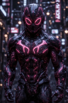 deepblack,JMstyle-CGI,JMstyle-CGI,A highly detailed digital artwork of a character from the Marvel Cinematic Universe, specifically Spider-Man, wearing a sleek, futuristic black and pink armored suit. The suit has a glossy texture and features intricate patterns and lines that glow with a neon pink light, creating a striking contrast with the dark background. The character's face is obscured by a high-tech mask with a large, angular eye piece that glows pink, giving the suit a high-tech and somewhat robotic appearance.The background is a blurred urban setting, likely at night, with neon lights and signs in various colors, including blue, purple, and pink, adding to the futuristic and cyberpunk atmosphere. The lighting is dramatic, with the character illuminated by a soft, cool light, while the background is more shadowy and darker.The character's physique is muscular and well-defined, suggesting a strong and agile body, fitting for a superhero. The overall style is a mix of realistic and stylized, with a focus on the sleek and futuristic design of the suit and the character's physique.The image is a high-quality digital painting with a high level of detail and realism, especially in the rendering of the suit's texture and the neon lights. The artist's signature is visible in the bottom right corner, indicating a professional and polished artwork.