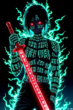Cyberpunk - style anime character, holding a long sword. The sword has red glowing effects and runes. The character is covered with fluorescent and mysterious rune tattoos, densely packed. The eyes emit a red glow. The background is black, surrounded by neon - green and blue - white energy - flowing effects, creating a mysterious and dangerous atmosphere. The overall picture features a strong color contrast and a powerful visual impact.