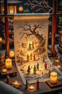 A work of art that combines ancient poetry and character scenes,where two ancient people travel into a painting and walk and talk under candlelight, The scroll is engraved with ancient poetry lines,combining Chinese style elements with realistic techniques to showcase the charm of Eastern aesthetics. A large paper tube is used as the visual center,surrounded by small dolls and candles to create an atmosphere,and lighting is used to illuminate specific areas,creating variations in depth and depth,