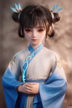 1girl, solo, looking at viewer, short hair, bangs, black hair, hair ornament,long sleeves, dress, brown eyes, closed mouth, upper body, wide sleeves, hair bun, double bun, blue dress, chinese clothes, own hands together, hair rings,,