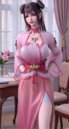 (masterpiece:1.2),Ultra clear, wallpaper, 8k, masterpiece, 1girl, solo, long hair, breasts, looking at viewer, bangs, large breasts,long dress,, bare shoulders, jewelry, black hair, standing, purple eyes, full body, flower, thighs, indoors, hair bun, long dress, high heels, cup, see-through, book, bare legs, window, table, white footwear, standing on one leg, curtains, pink flower, side slit, vase, ,(huge breasts:2.99),(full breasts:2.99),Xzhihua,Xsiyouyou,Xyanruyu,Xmoxiaonan,Xyeqingxian,Xyinxuehou,Xpoyuhou,XbaihehuaiX,Xjiangbilan,Xhuajin,XshengcaierY,Xmengyuyi,Xxiaomei,Xhujiaoer,Xfuxinyun,Xhumeier
