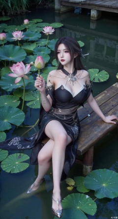 (masterpiece:1.2),best quality,The image is a digital illustration of a young woman sitting on a wooden bench in a pond with lily pads. She is wearing a long dress with design on the chest and sleeves. The dress has a high neckline and short sleeves,Holding a lotus in hand. She has long dark hair styled in loose waves and is wearing gold high heels. The woman is posing with one hand on her hip and the other resting on the edge of the bench. The background is filled with pink and white lotus flowers and green leaves. The overall mood of the image is peaceful and serene,(huge breasts:2.99),(full breasts:2.99),(Background with traditional Chinese architecture, lotus pond and pink lotus flowers:1.39),Xanmiaoyi,Xyunwangshu,XlishaoyinY,Xbaixue,XanmiaoyiY,Xxiuqiuhua,XbaiyuerongY,XyunyunX,XqingnvzongZM,Xjuzi,Xshangguanweier,XanmiaoyiXY,XyunyunXY,Xjiangziyue,Xmeining,Xweinina,Xlenhuan,Xbabata,Xhuajin,Xjiangbilan,XbaihehuaiX,Xfuxinyun,Xhumeier,XhewanyuzhiyaoY,XlimuwanBF