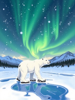 A polar bear ice skating on a frozen lake shaped like a violin. Background: aurora borealis with musical note constellations.