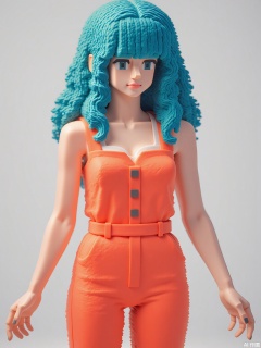 A geometric woman with peacock-blue cube hair wears a coral-colored jumpsuit with visible topology lines. Her arms extend outward, palms facing forward with subtle glow effects.