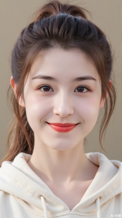 Hani Kyzy, 1girl, solo, looking at viewer, smile, brown hair, brown eyes, closed mouth, upper body, ponytail, hood, lips, hoodie, hood down, realistic, red lips, blurry, UHD, super detail, high details, high quality, best quality, 8k
