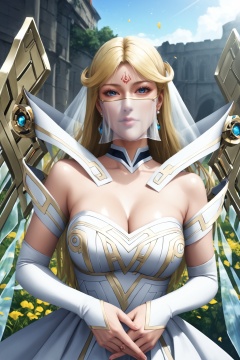 safe_pos,score_9,score_8_up,score_7_up,Xuehuang,1girl,blonde hair,blue eyes,veil,solo,mouth veil,lipstick,red lips,dress,mechanical wings,wings,looking at viewer,white dress,mask,long hair,earrings,bare shoulders,jewelry,gloves,elbow gloves,breasts,forehead mark,looking at viewer,(cowboy shot:1.5),nice hands,<lora:pony超兽武装-雪皇:0.8>,huge breasts,cleavage,(highres, high quality:1.3),intricate details,sharp focus,depth of field,outdoors,sunlight,soft focus,bright skin,Holy lighting,white skin,mature female,magnificent architecture,beautiful detailed sky,overexposure,dynamic pose,dynamic angle,<lora:add-detail-xl:0.5>,mature female,curvy,shiny skin,oiled skin,Expressiveh,((ink)),(water color),bloom effect,detailed beautiful grassland with petal,flower,butterfly,petal,(((surrounded by heavy floating petal flow))),