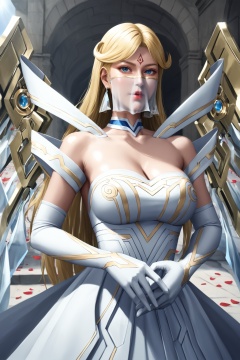 safe_pos,score_9,score_8_up,score_7_up,Xuehuang,1girl,blonde hair,blue eyes,veil,solo,mouth veil,lipstick,red lips,dress,mechanical wings,wings,looking at viewer,white dress,mask,long hair,earrings,bare shoulders,jewelry,gloves,elbow gloves,breasts,forehead mark,(fighting stance:1.5),looking at viewer,(cowboy shot:1.5),nice hands,<lora:pony超兽武装-雪皇:0.8>,huge breasts,cleavage,(highres, high quality:1.3),intricate details,sharp focus,depth of field,outdoors,sunlight,soft focus,bright skin,Holy lighting,white skin,mature female,magnificent architecture,beautiful detailed sky,overexposure,dynamic pose,dynamic angle,<lora:add-detail-xl:0.5>,mature female,curvy,shiny skin,oiled skin,Expressiveh,((ink)),(water color),bloom effect,detailed beautiful grassland with petal,flower,butterfly,petal,(((surrounded by heavy floating petal flow))),