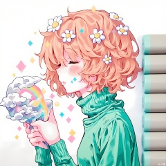 A gender-neutral figure with curly peach-pink hair adorned with floating daisies, wearing a mint-green turtleneck with cloud-shaped cuffs. They hold a translucent wand with swirling galaxy patterns, eyes closed in peaceful concentration. Delicate rainbow confetti dots drift around their serene face.