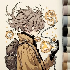 A time traveler with silver-streaked hair, wearing a trench coat with pocket watch chains. They hold a glowing hourglass emitting golden sand, expression thoughtful. Soft sepia and cream tones blend with floating clock gears in the air.