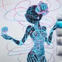 MKB, there are several markers on the side of the background. A cybernetic hand holding a holographic rose, wires and circuits visible beneath translucent skin. The rose pulses with data streams, eyes hidden behind augmented reality visors. Neon-blue and pink accents contrast with the white background, surrounded by floating binary code.