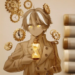MKB, there are several markers on the side of the background. A time traveler with silver-streaked hair, wearing a trench coat with pocket watch chains. They hold a glowing hourglass emitting golden sand, expression thoughtful. Soft sepia and cream tones blend with floating clock gears in the air.