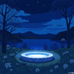 The image depicts a serene nighttime scene with a circular stone structure emitting a soft blue light in the foreground. Surrounding the structure is lush green grass dotted with small white flowers. The background showcases a tranquil lake reflecting the night sky, with distant mountains silhouetted against the dark blue sky. Wispy clouds and a few stars are visible, adding to the peaceful ambiance. The overall atmosphere is calm and magical, evoking a sense of wonder and tranquility.