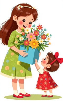 Mother's Day illustration elements,A vibrant digital illustration depicts a young girl with long brown hair in a green dress with floral patterns,holding a bouquet of colorful flowers in a blue box. She smiles warmly as a toddler in a red dress with a large bow and white socks reaches up to touch the bouquet.,