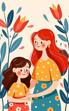Mother's Day illustration elements, A digital illustration in a whimsical, flat design style depicts a mother with long, wavy red hair and a young girl with brown hair, both with rosy cheeks, smiling. They wear colorful, patterned clothes amidst a vibrant, abstract floral background with large, stylized flowers and leaves in shades of blue, orange, and pink.