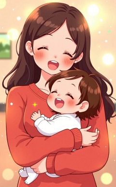 Mother's Day illustration elements, This digital anime-style drawing depicts a joyful mother with long brown hair and rosy cheeks, embracing a happy baby with short brown hair. Both have closed eyes and wide smiles, set against a soft, blurred background with warm, glowing orbs. The mother wears a red sweater, and the baby is in a white onesie.