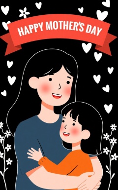 Mother's Day illustration elements, A digital illustration depicts a mother with long black hair and a young girl with shoulder-length black hair, both smiling, embracing each other. The mother wears a dark blue shirt, and the girl wears an orange top. Above them, a red banner reads "HAPPY MOTHER'S DAY." The background is black with white hearts and stylized flowers.