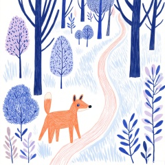 A whimsical, hand-drawn illustration in a folk-art style depicts a serene forest scene. A small, orange fox with a simple, cartoonish design stands on a winding path. The background features various stylized trees and bushes in shades of blue and purple, creating a calm, dreamy atmosphere. The overall color palette is soft and soothing.