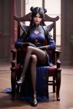 1girl, solo, long hair, breasts, looking at viewer, black hair, gloves, long sleeves, dress, jewelry, sitting, closed mouth, pantyhose, earrings, black gloves, indoors, necklace, hair bun, black footwear, lips, black pantyhose, double bun, blue dress, chair, crossed legs, circlet, realistic,