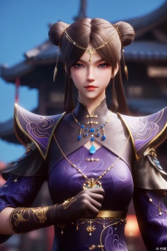 1girl, solo, long hair, looking at viewer, black-hair,brown hair, hair ornament, gloves, dress, jewelry, upper body, black gloves, hair bun, blurry, double bun, blurry background, chinese clothes,