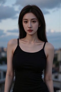 Ultra photoreal, Insane Details, 32K, Realistic, Real photo,Frontal photography, looking forward, evening, dark clouds, sunset, on city rooftops, a woman,black dress, black hair, long hair, dark theme, pastel tones, pastel colors, high contrast, (natural skin texture, Low Light, HD) ((Sky Background)) (Facial Highlights)), Light Master, 1girl, Photograp, Excellent Image Quality, Perfect Body,dark theme,soft tones,light master,evening,photograp,masterpiece,Skin details
