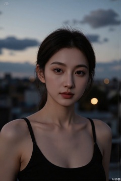 Ultra photoreal, Insane Details, 32K, Realistic, Real photo,Frontal photography, looking forward, evening, dark clouds, sunset, on city rooftops, a woman,black dress, black hair, long hair, dark theme, pastel tones, pastel colors, high contrast, (natural skin texture, Low Light, HD) ((Sky Background)) (Facial Highlights)), Light Master, 1girl, Photograp, Excellent Image Quality, Perfect Body,dark theme,soft tones,light master,evening,photograp,masterpiece,Skin details