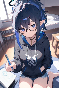 crisp,key999,gwwj,ka ra ra ge tsu ne,Mika Pikazo,ezu,masterpiece,best quality,very aesthetic,1girl,extremely delicate and beautiful,Noise and grain,huge filesize,amazing quality,foreshortening,streaked hair,blue eyes,bored,stylish_pose,hair_up,black-framed_eyewear,hoodie,collarbonea,bedroom,elf,blue and black hair,micro_shorts,black_choker,bags under eyes,looking_at_viewer,high ponytail,mole under eye,dim,black color vibe,illustration,Mezzotint,mature_female,elf ears,mechanical_halo,blue and black theme,colorful,chromatic_aberration,stud_earrings,notebook,table,chair,black top,dutch angle,holding_paper,cowboy_shot,yokozuwari,from_above,hand_in_pocket,indian_style,