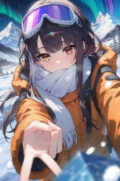 crisp,gwwj,Mika Pikazo,ezu,melting,yejji,masterpiece,best quality,very aesthetic,1girl,extremely delicate and beautiful,Noise and grain,huge filesize,hatching_(texture),streaked hair,messy hair,blurry,long hair,winter_coat,Alps,Heavy snowfall on the way to the mountain,climbing equipment,black color vibe,goggles_on_head,scarf,the snow falls heavily,scarf_over_mouth,((ASCII art)),upper_body,looking_at_viewer,foreshortening,dynamic_angle,colorful,aurora,highres,illustration,black hair,water vapor,v,