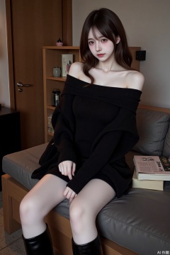 1girl,solo,long hair,looking at viewer,brown hair,long sleeves,dress,bare shoulders,sitting,closed mouth,boots,indoors,off shoulder,black footwear,black dress,sweater,lips,grey eyes,book,wavy hair,knee boots,red lips,black sweater,sweater dress,off-shoulder sweater